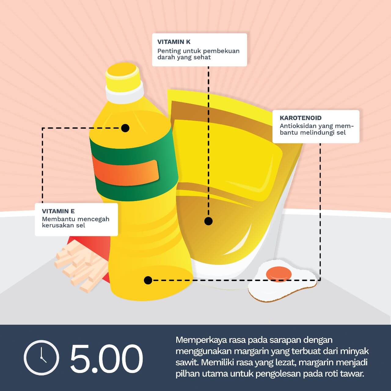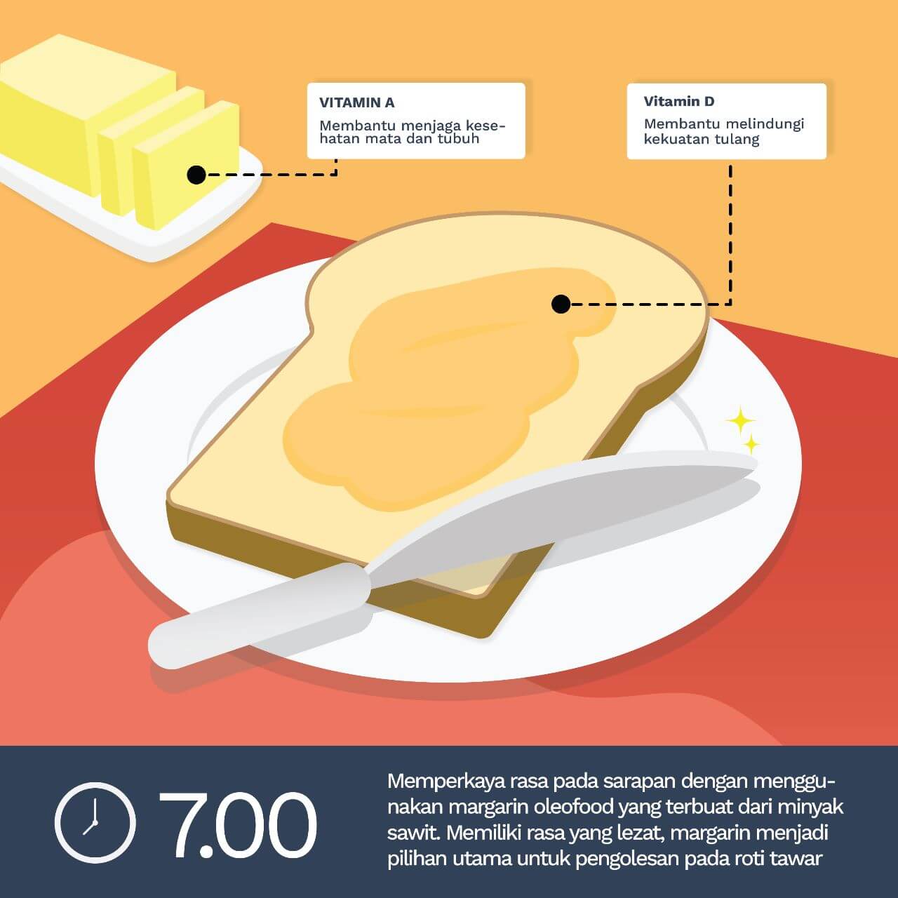 Pagi Hari, Jam 7 – Memperkaya rasa pada sarapan dengan menggunakan margarin yang terbuat dari minyak sawit. Memiliki rasa yang lezat, margarin menjadi pilhan utama untuk pengolesan pada roti tawar.