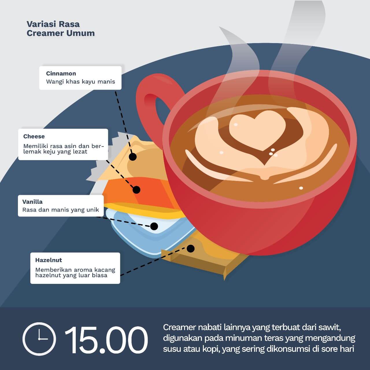 Sore Hari, Jam 3 sore – Creamer nabati lainnya yang terbuat dari sawit, digunakan pada minuman teras yang mengandung susu atau kopi, yang sering dikonsumsi di sore hari.