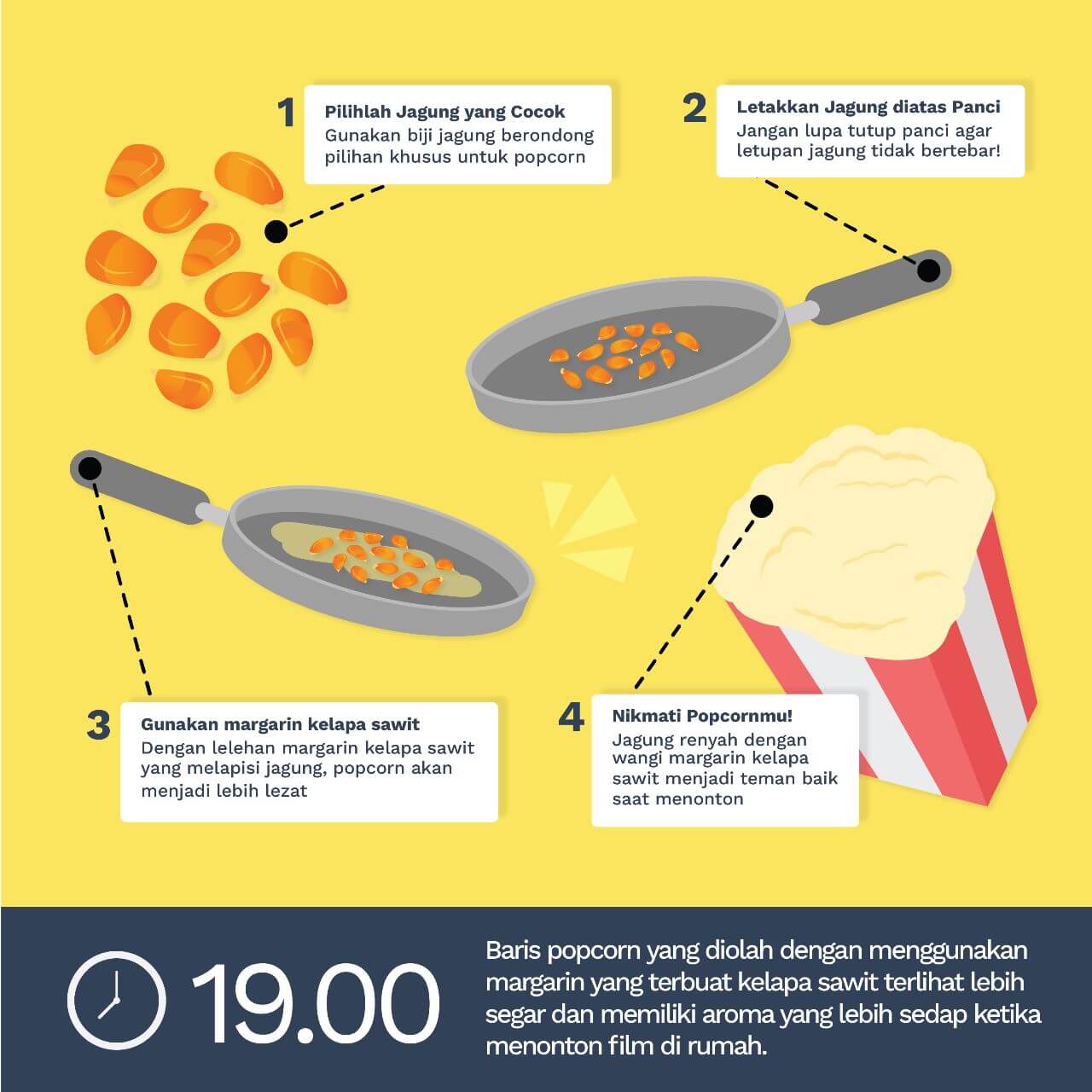 Malam Hari, Jam 7 malam – Baris popcorn yang diolah dengan menggunakan margarin yang terbuat dari sawit terlihat lebih segar dan memiliki aroma yang lebih sedap ketika menonton film di rumah.