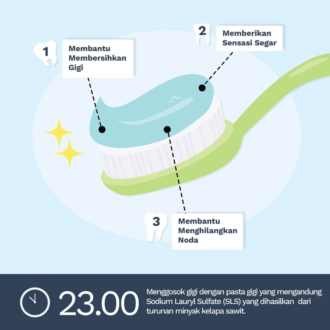 Malam Hari, Jam 11 malam – Menggosok gigi di malam hari dengan pasta gigi yang mengandung Sodium Lauryl Sulfate (SLS) yang dihasilkan dari turunan minyak sawit. SLS membantu pasta gigi menjadi lebih efektif dalam memperbaiki permasalahan kesehatan gigi.
