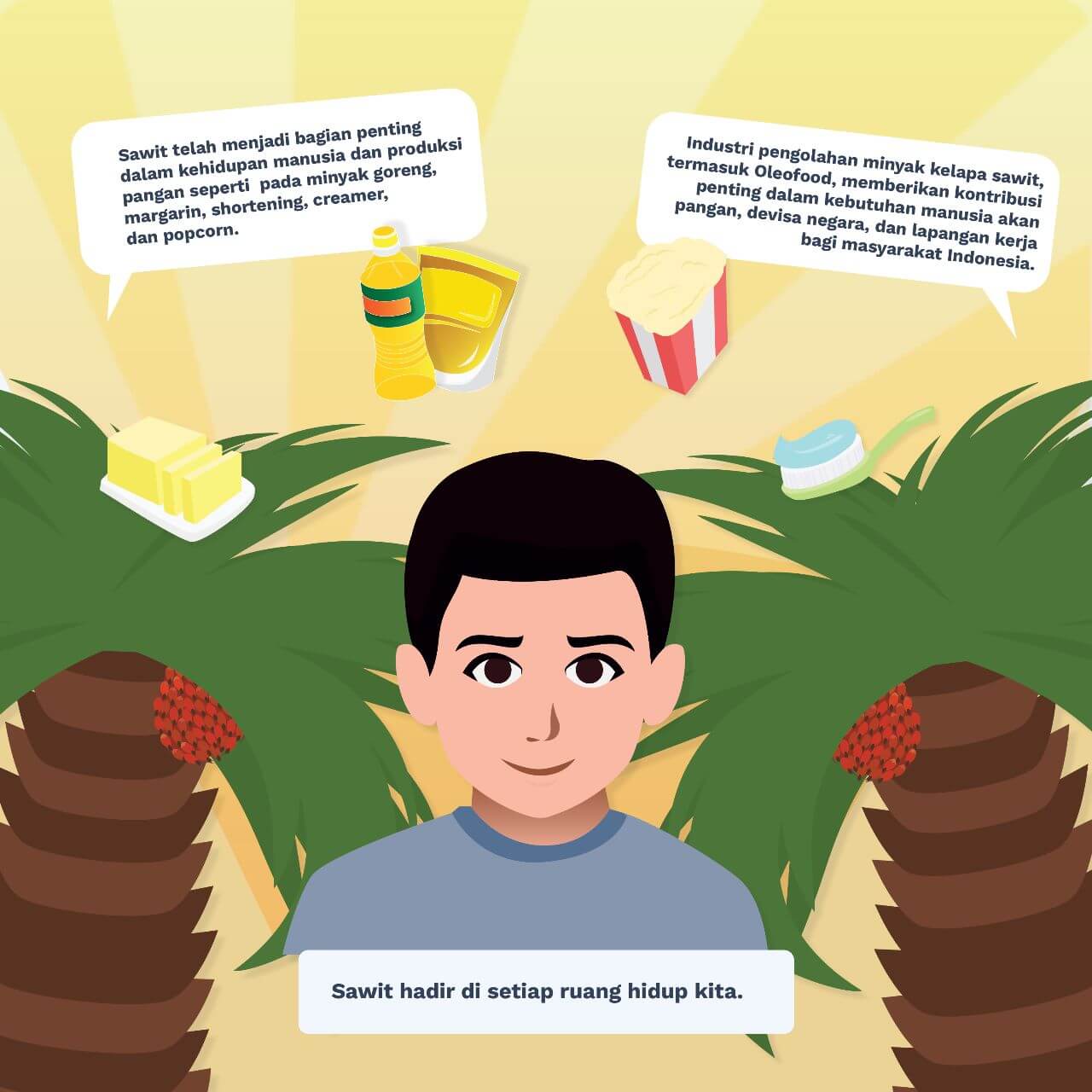 Dalam 24 jam hidup sehari-hari kita, Sawit telah hadir di dalam setiap ruang hidup kita. Industri pengolahan Sawit, telah memberikan kontribusi penting dalam kebutuhan manusia akan bahan pangan. Bagi Indonesia, minyak sawit adalah sumber penting devisa negara dan juga memberikan jutaan lapangan kerja bagi masyarakat Indonesia.