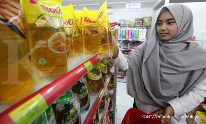 Konsumen membeli minyak goreng kemasan di minimarket Tangerang Selatan, Jumat (6/4). Kementerian Perdagangan mewajibkan produsen minyak goreng menjual minyak goreng kemasan sederhana dengan harga Rp 6500, Rp 10.500 dan Rp 11.000./pho KONTAN/Carolus Agus Waluyo/06/04/2018.